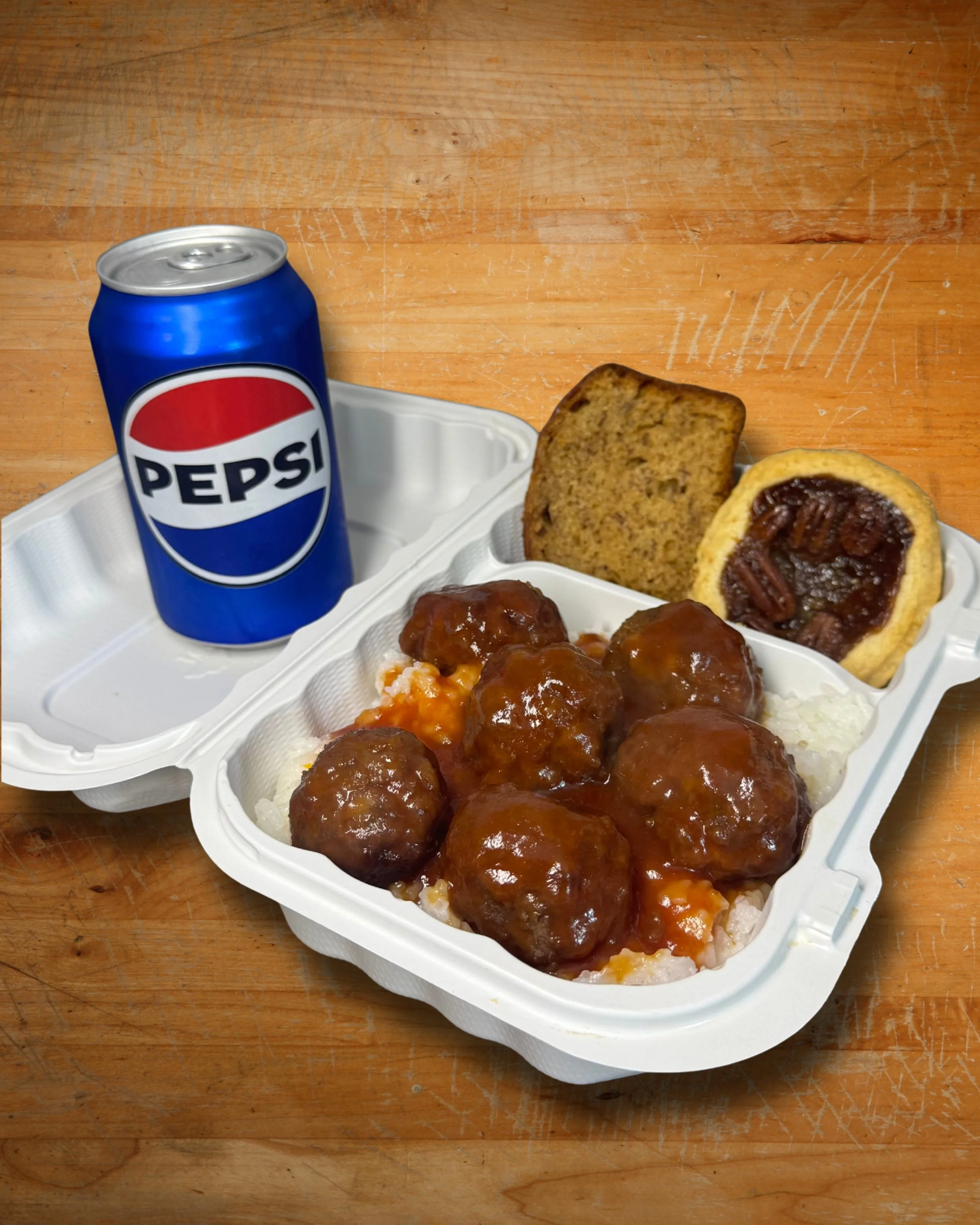 6 meatballs served with 1½ cups of white rice, your choice of dessert, and Pepsi or water to drink.